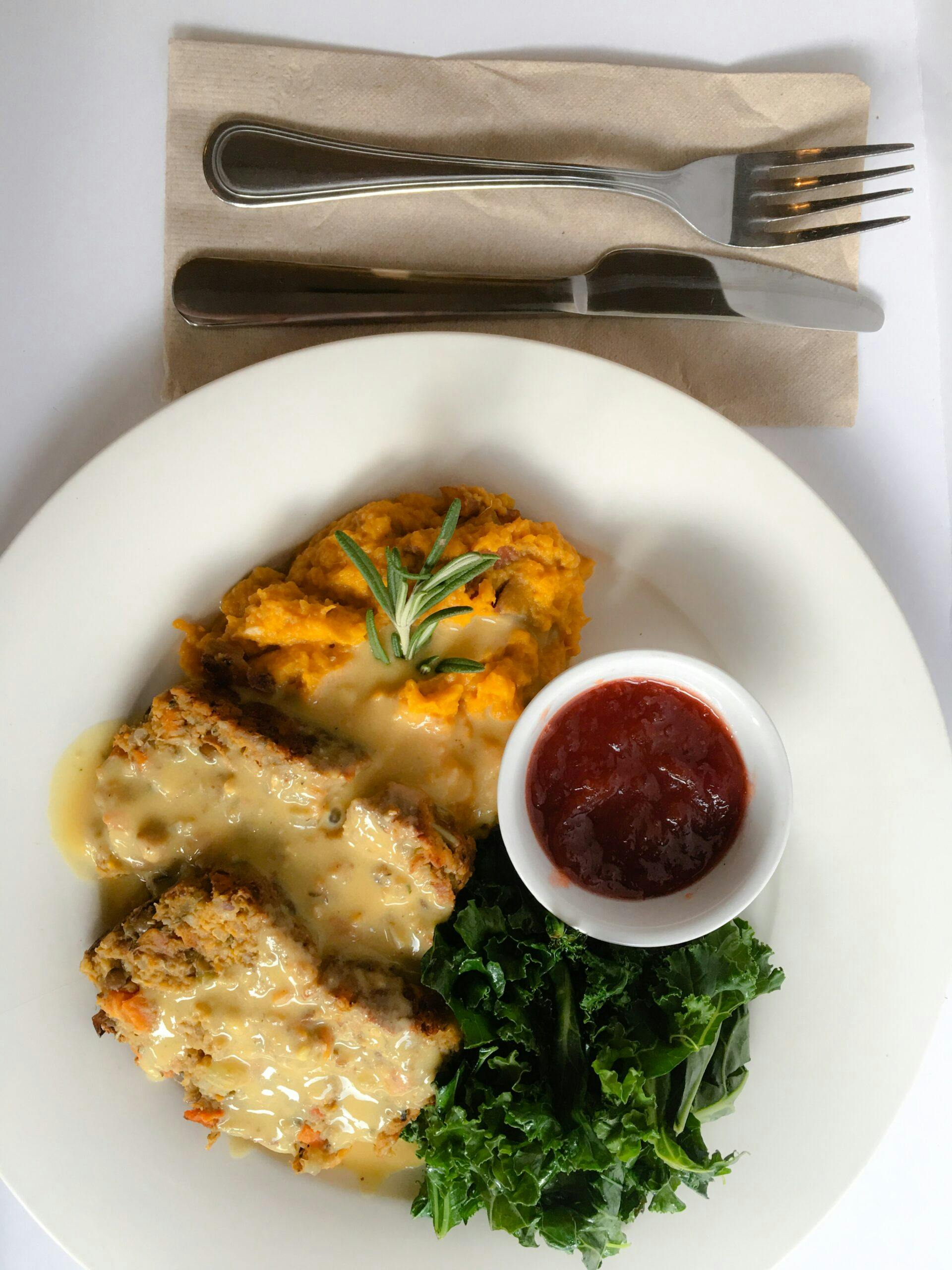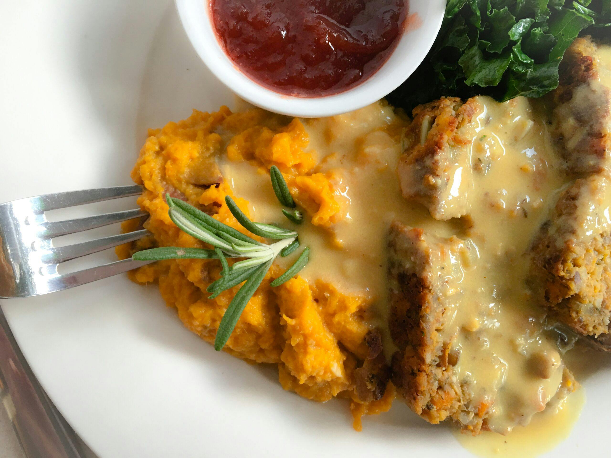 8. Serve with some sautéed kale or brussels sprouts and chipotle & rosemary mashed sweet potatoes, and vegan gravy.