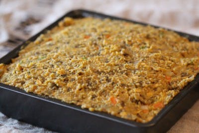 7. Put mixture in an 8 X 8 cake pan that is lined with parchment paper. Bake for 50 minutes UNCOVERED at 375F. You need it to be uncovered…. and allow it to brown on the edges. Remove from oven and let it cool for 5 minutes before cutting into pieces