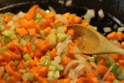 3. Saute the chopped onions for 2 minutes on medium high heat, then add the minced garlic for another minute until very fragrant. Reduce heat now and add the finely diced celery and carrots. Saute for 10 minutes on medium heat. Add fresh rosemary (1 tbsp) and thyme (1 tbsp), dried basil and dried chilis. Set aside.