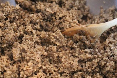 4. Now you get to start combining everything you’ve prepped so far. In a large mixing bowl add the Millet, Quinoa and Lentil mixture. Now add carrots, celery and onion mixture and fold. Then add the measured GF Oats, dried parsley, nutritional yeast, coarsely crumbled raw almonds (pulsed in the food processor) and miso with added water.