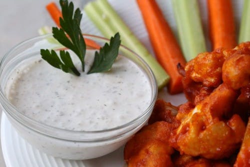 Yes, things are much different now, after going to a plant-based diet (vegan) 7 years ago, but he (and Mike too) still have cravings for that wing hot sauce flavour and the Ranch Dressing you get with your typical wings and celery and carrot sticks.